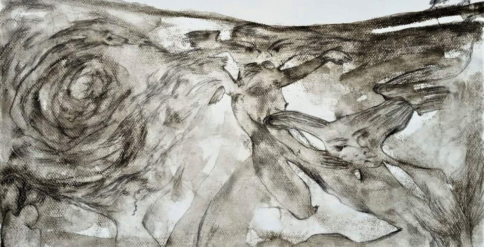 I used my fingers, a few brushes, a bit of water here and there, and a tiny intervention of my kneaded eraser to "animate" the surface of my sheets after coating them with a layer of charcoal. By the way, you can use this strategy to overcome blank page anxiety (if you're one of its victims).
